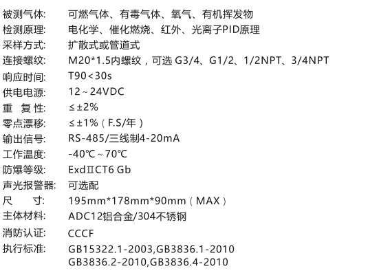 結(jié)構(gòu)模塊化、維護方便,接線安裝簡單國瑞智能傳感器平臺,可即插即用,無需現(xiàn)場標定快速響應、測量精度高,運行穩(wěn)定的檢測儀器通過防爆認證、防護等級IP65、防腐蝕性高、抗電磁干擾豐富的傳感器量程選擇,可以滿足客戶的要求智能傳感器平臺,可即插即用,離線標定LCD實時顯示氣體濃度,有儀器狀態(tài),故障和通訊異常提示功能可設置高低報警點,兩級聲光報警兩路繼電器可以控制外圍設備(如風機和聲光報警器)動作產(chǎn)品選擇材質(zhì)優(yōu)秀,具有良好的密封性,防腐性,防爆和抗磁干擾強儀表具用4-20MA輸出與RS-485輸出可以與GRI-8000系列和GRI-9800系列報警主機組網(wǎng)使用可以與GRI-9802單點報警主機組網(wǎng),每點匹配,點點組合。